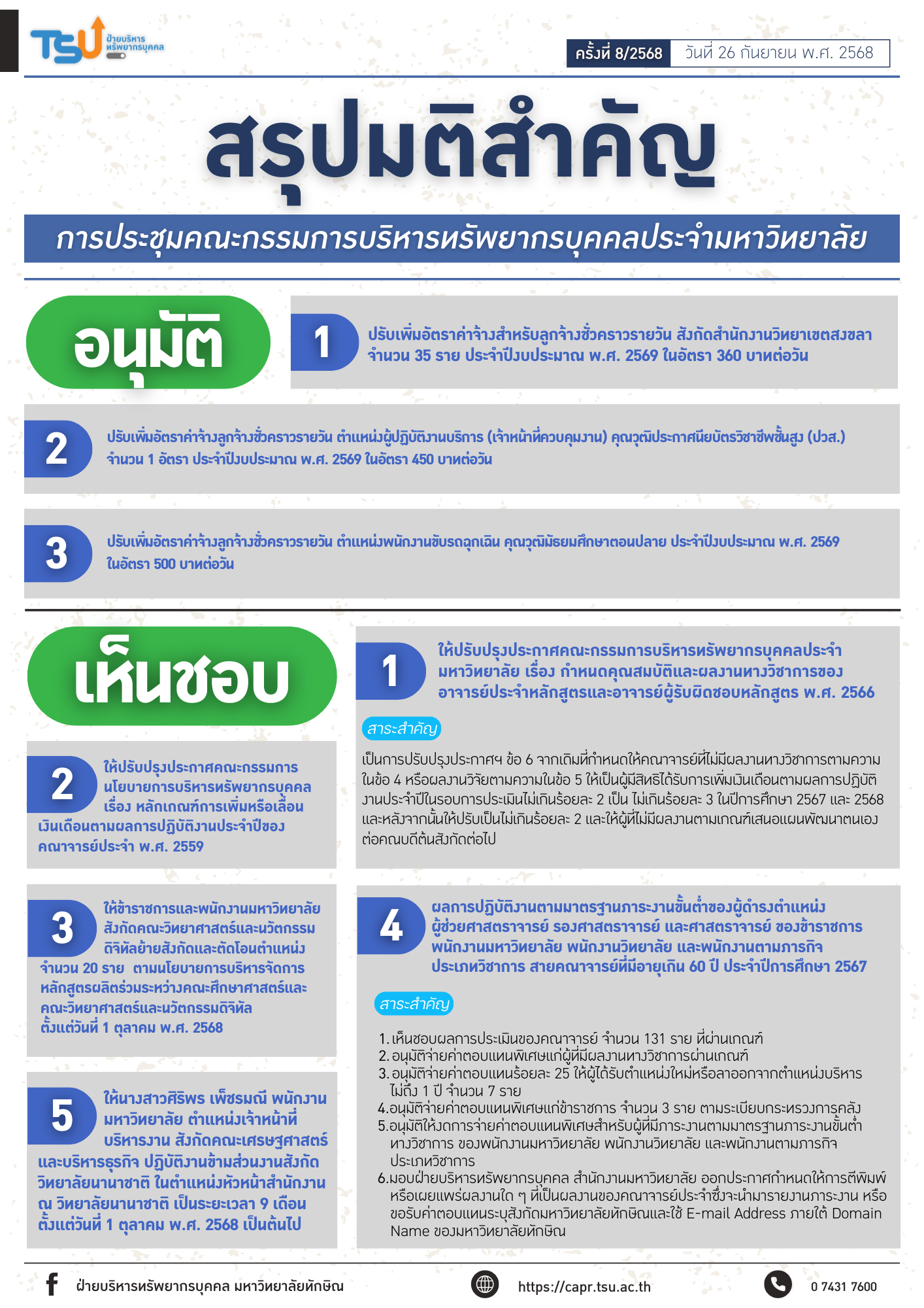 สรุปมติการประชุมคณะกรรมการบริหารทรัพยากรบุคคลประจำมหาวิทยาลัย (ก.บ.ม.) ครั้งที่ 8/2568 วันที่ 26 กันยายน 2568