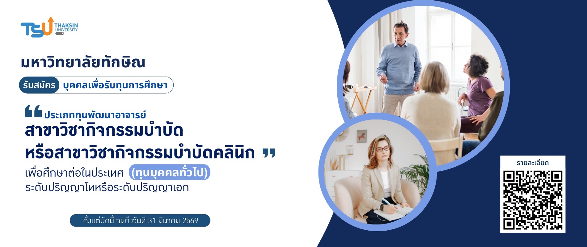 มหาวิทยาลัยทักษิณ รับสมัครคัดเลือกบุคคลเพื่อรับทุนการศึกษา ประเภททุนพัฒนาอาจารย์ ระดับปริญญาโทหรือระดับปริญญาเอก สาขาวิชากิจกรรมบำบัด หรือสาขาวิชากิจกรรมบำบัดคลินิก เพื่อศึกษาต่อในประเทศ (ทุนบุคคลทั่วไป) จากกองทุนพัฒนาบุคลากรมหาวิทยาลัยทักษิณ ประจำปีการศึกษา 2569