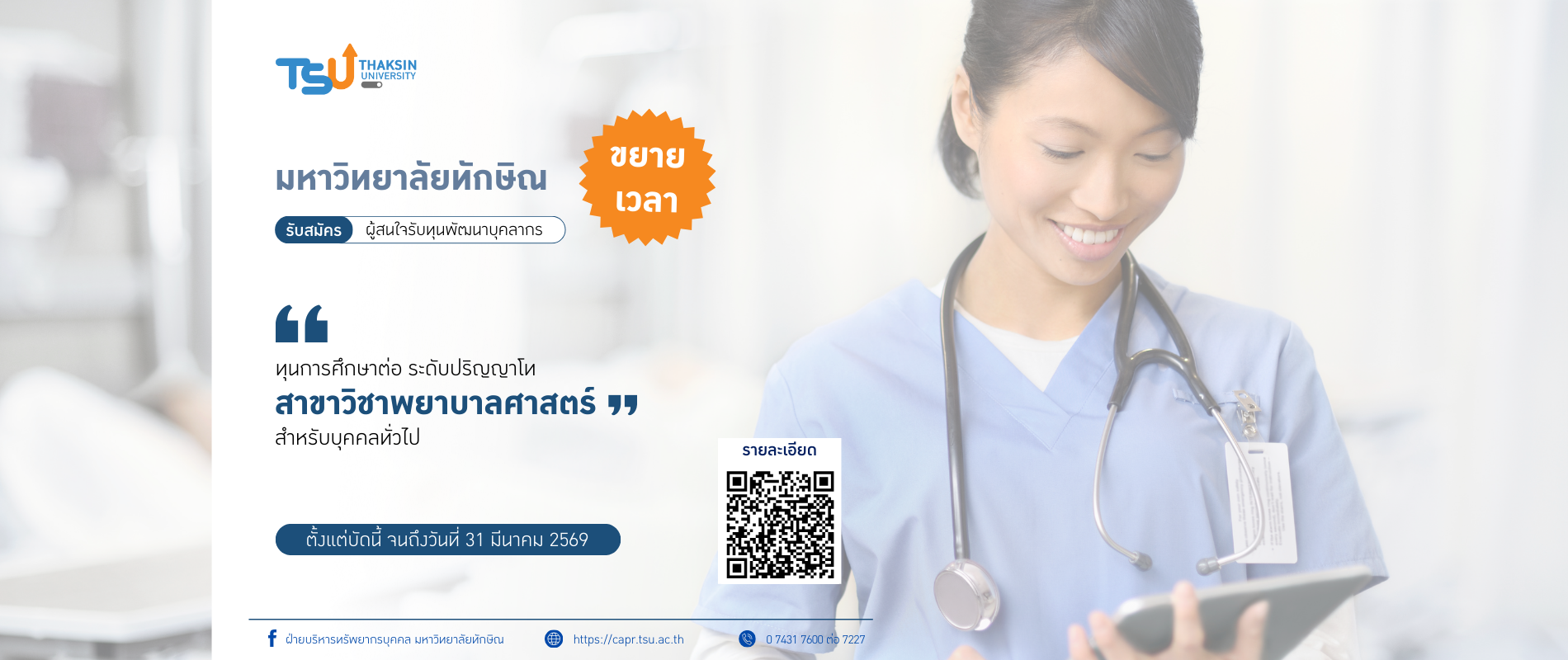มหาวิทยาลัยทักษิณ ⏰ ขยายเวลา⏰ รับสมัครคัดเลือกบุคคลเพื่อรับทุนการศึกษา ในระดับปริญญาโท จากกองทุนพัฒนาบุคลากรมหาวิทยาลัยทักษิณ ประจำปีการศึกษา 2569
