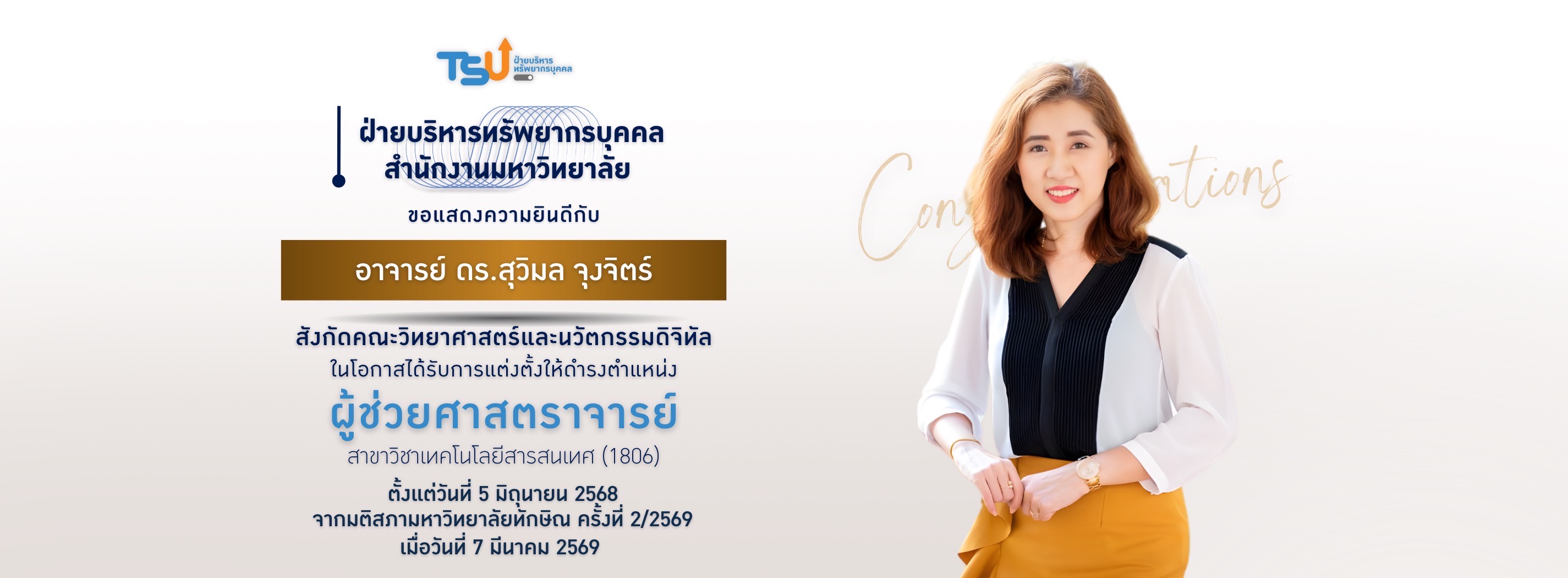 ขอแสดงความยินดีกับ อาจารย์ ดร.สุวิมล จุงจิตร์ สังกัดคณะวิทยาศาสตร์และนวัตกรรมดิจิทัล ตำแหน่งผู้ช่วยศาสตราจารย์ สาขาวิชาเทคโนโลยีสารสนเทศ (1806) ตั้งแต่วันที่ 5 มิถุนายน 2568