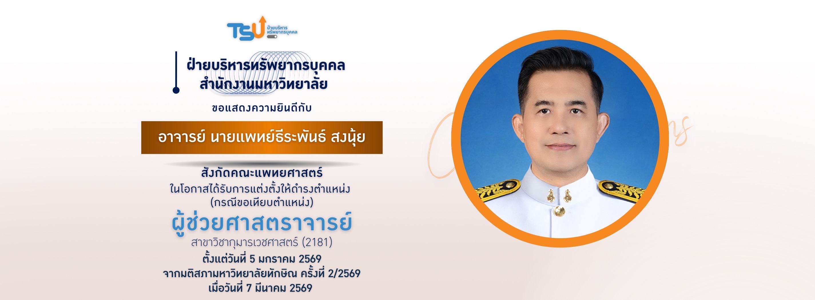 ขอแสดงความยินดีกับ อาจารย์ นายแพทย์ธีระพันธ์ สงนุ้ย สังกัดคณะแพทยศาสตร์ ซึ่งขอเทียบตำแหน่งผู้ช่วยศาสตราจารย์ สาขาวิชากุมารเวชศาสตร์ (2181) ตั้งแต่วันที่ 5 มกราคม 2569