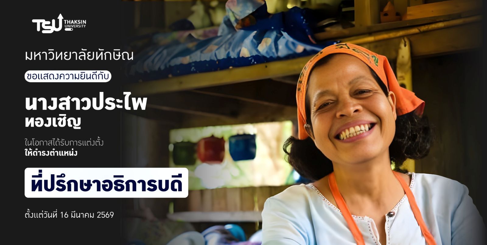 ขอแสดงความยินดีกับ นางสาวประไพ ทองเชิญ เนื่องในโอกาสได้รับการแต่งตั้งให้ดำรงตำแหน่งเป็นที่ปรึกษาอธิการบดี